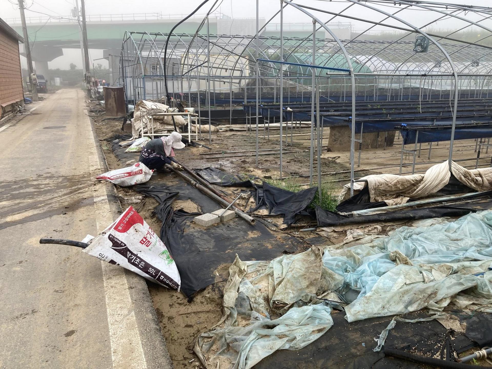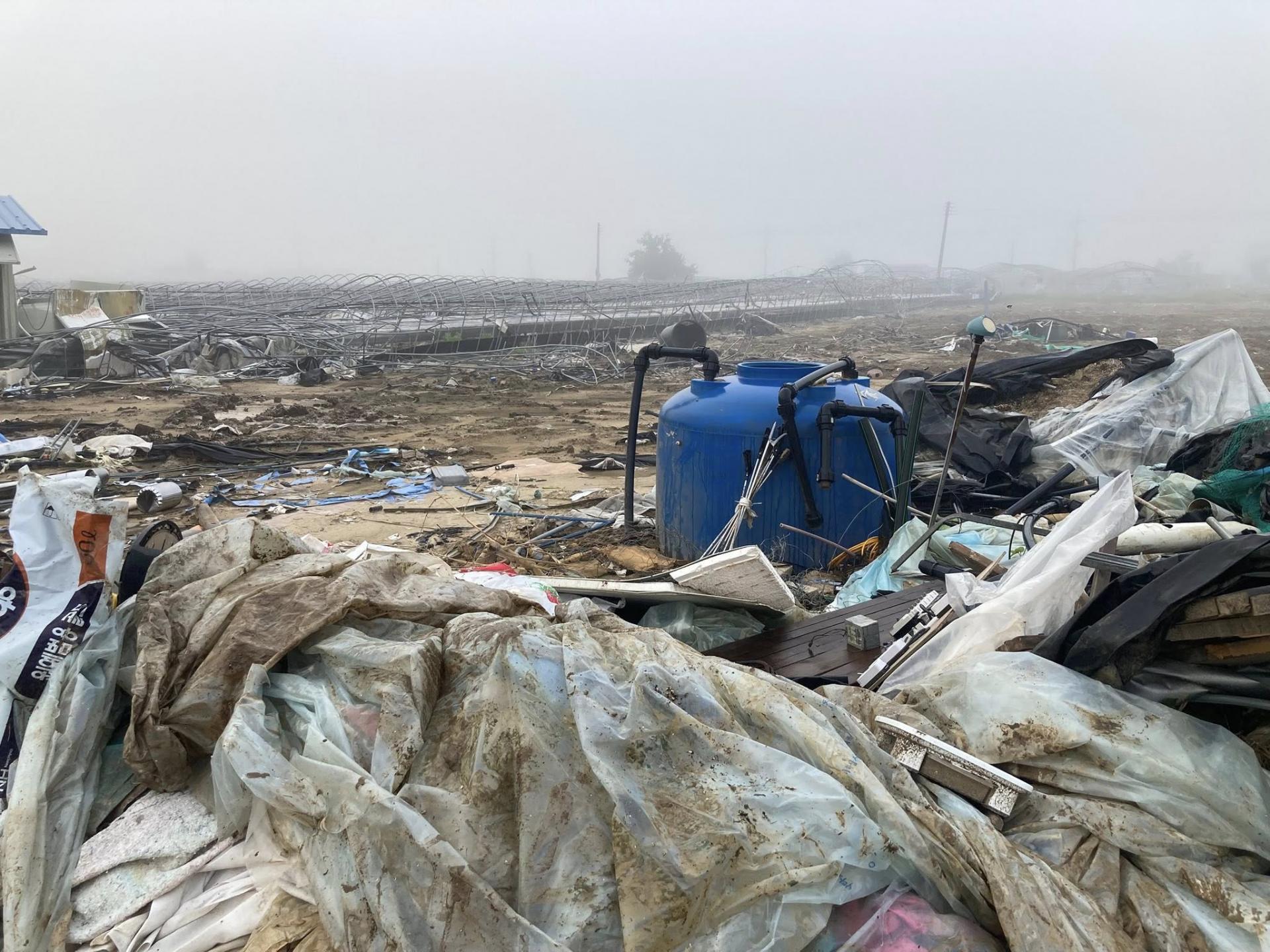 보통 강의 주변에는 지하수를 이용해서 작물의 키우는 비닐하우스가 많은데요, 폭우에 강의 수위가 높아져 있다가 강둑의 일부가 터지면 강한 물살에는 하우스가 완전 파손되고 직접적인 물살을 피한 곳은 하우스 천정까지 물이 차게 됩니다.