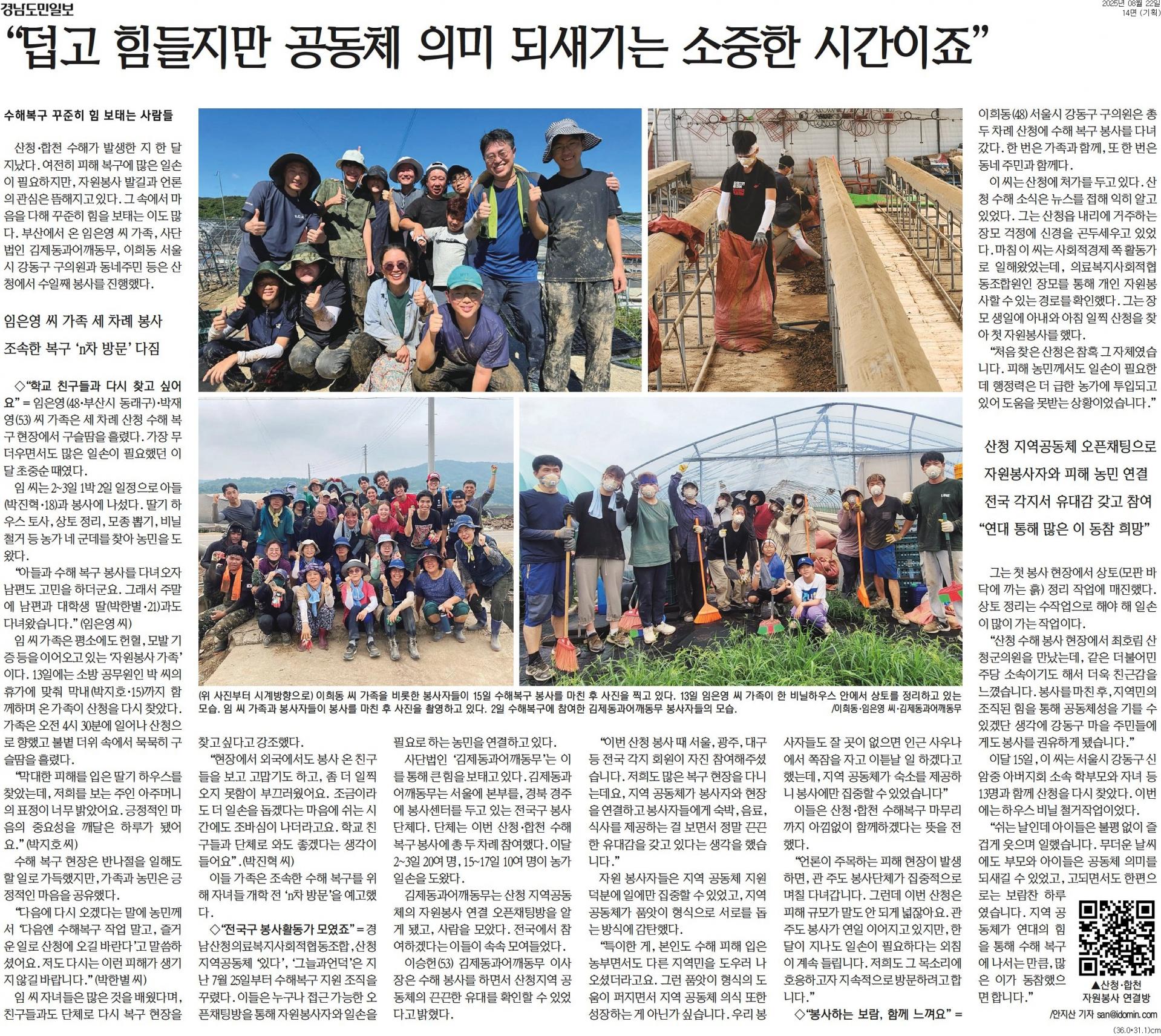산청지역에 계속해서 관심을 가져주시고 하루 빨리 수해를 입은 모든 분들이 복구를 마치고 일상으로 돌아오실 수 있길 바랍니다.
