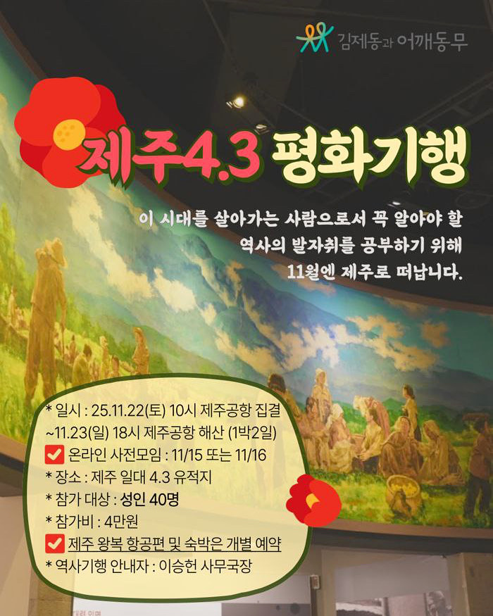 올해 마지막 어깨동무 역사기행은 '제주'로 떠납니다. 관광지로만 찾아갔던 제주를 다르게 만날 수 있는 제주 4.3 사건을 중심으로 역사의 발자취를 따라갑니다. 가슴 아프고 잊어서는 안될 대한민국 역사의 한 페이지인 제주 평화기행에 함께 해주세요~