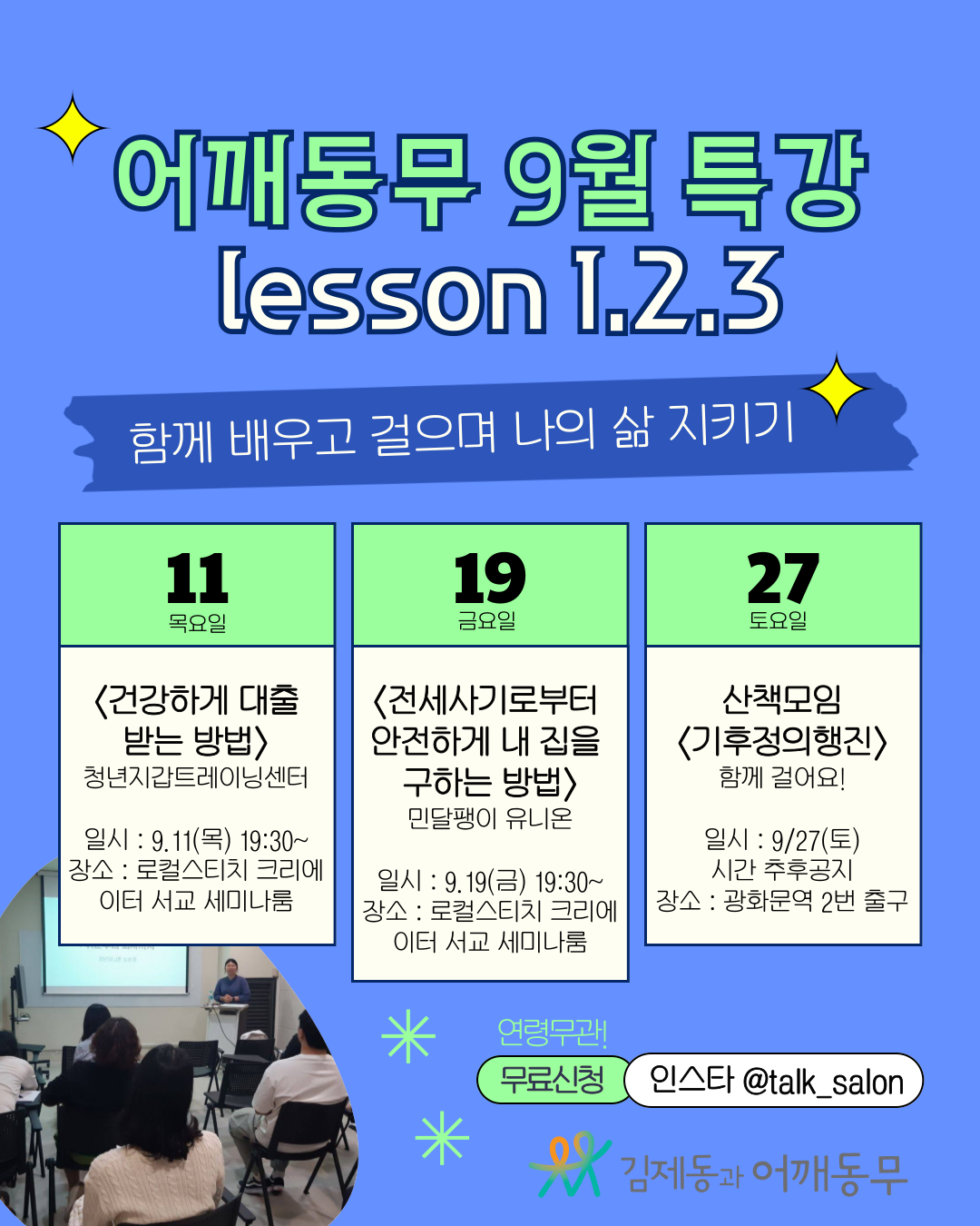 김제동과어깨동무에서는 '함께 배우고 걸으며 나의 삶 지키기'라는 주제로 9월 무료 특강이 진행됩니다.