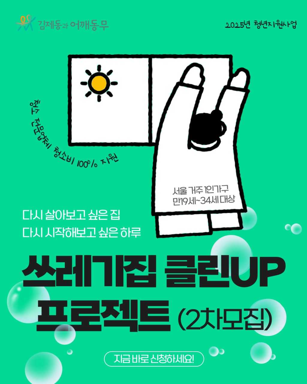 김제동과어깨동무는 쓰레기집 문제가 단순히 청년 개인의 문제가 아닌 기회가 사라지고 각박해져 가는 사회가 만들어낸 사회 문제라고 생각을 합니다. 이에 '김제동과어깨동무'는 쓰레기를 가득 안고 사는 청년들이 다시 쾌적한 환경에서 거주할 수 있도록 '쓰레기집 클린UP' 프로젝트 2차모집을 실시합니다.