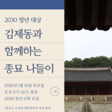 - 공지 완료 2030 청년을 위한 김제동과 함께하는 종묘 나들이(1/10) 2026년 새해 첫 역사기행은 김제동님과 함께하는 서울 '종묘'로 준비했습니다!조선과 대한제국의 역대 왕과 왕비, 황제와 황후의 신주를 모시고 제사를 지내는 국가 사...